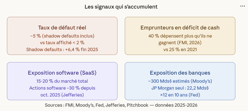 En comptant les shadow defaults — ces entreprises qui ne remboursent pas en cash mais négocient du PIK, paiement en nature, c’est-à-dire encore plus de dette — le taux réel approche les 5 %.