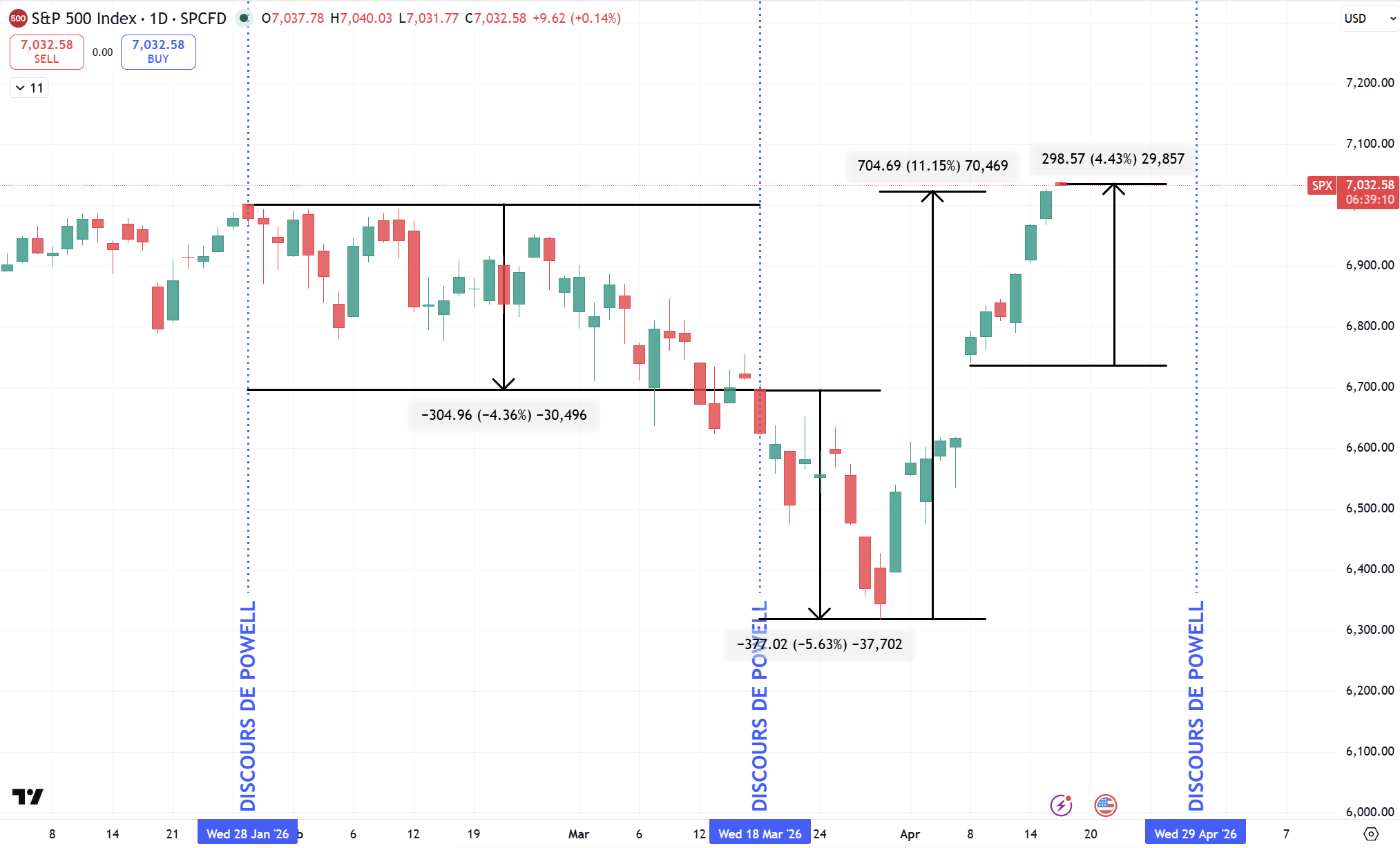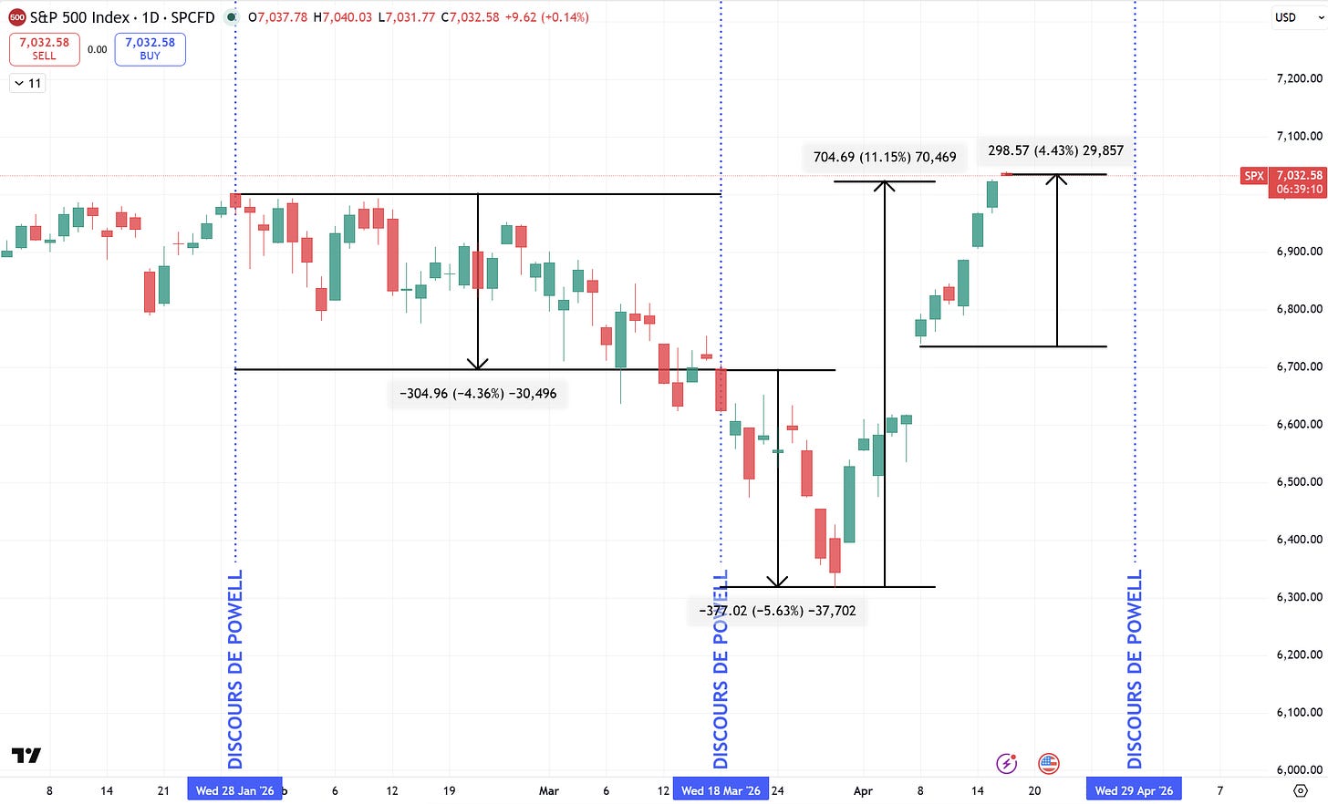 → Le 28 janvier dernier, Powell parle — le S&P chute de - 4,3 % dans les jours qui suivent.