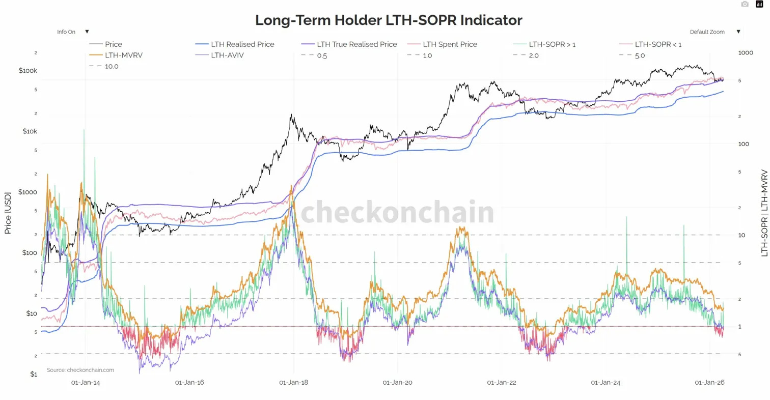 Le LTH-SOPR mesure si les détenteurs de longue date — ceux qui holdent depuis plus de 155 jours — vendent leurs bitcoins en gain ou en perte.