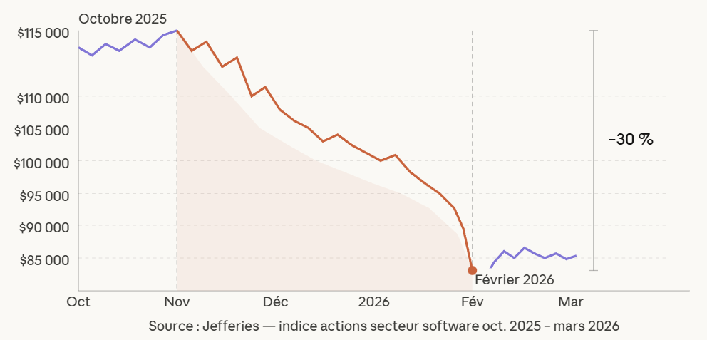Les actions du secteur software ont chuté de 30 % entre octobre 2025 et février 2026.