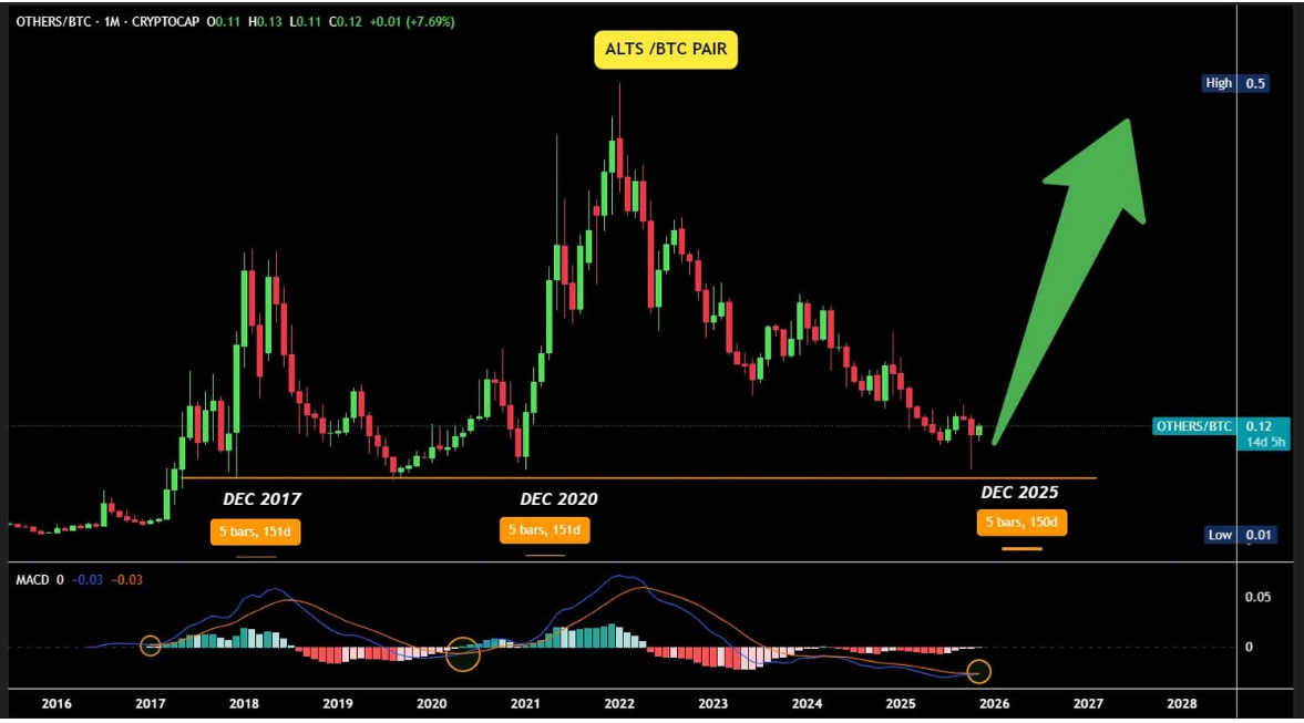 (les Altcoins sont actuellement à un plus bas depuis 4 ans, veille de la précédente Alt Season)
