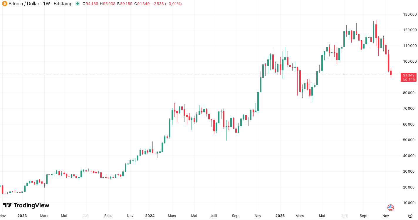 Le Bitcoin a enfoncé cette semaine les 90.000 $, clôturant en-dessous de sa moyenne mobile à 50 semaines.