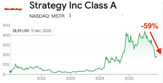 les retracements de Bitcoin suite aux nombreuses liquidations, MSTR étant plus volatile que BTC
