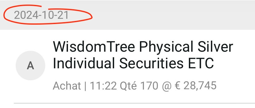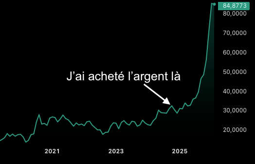 ➡️ Sur l’Argent le gros de mes positions datait d’octobre 2024 (acheté 28 €) :