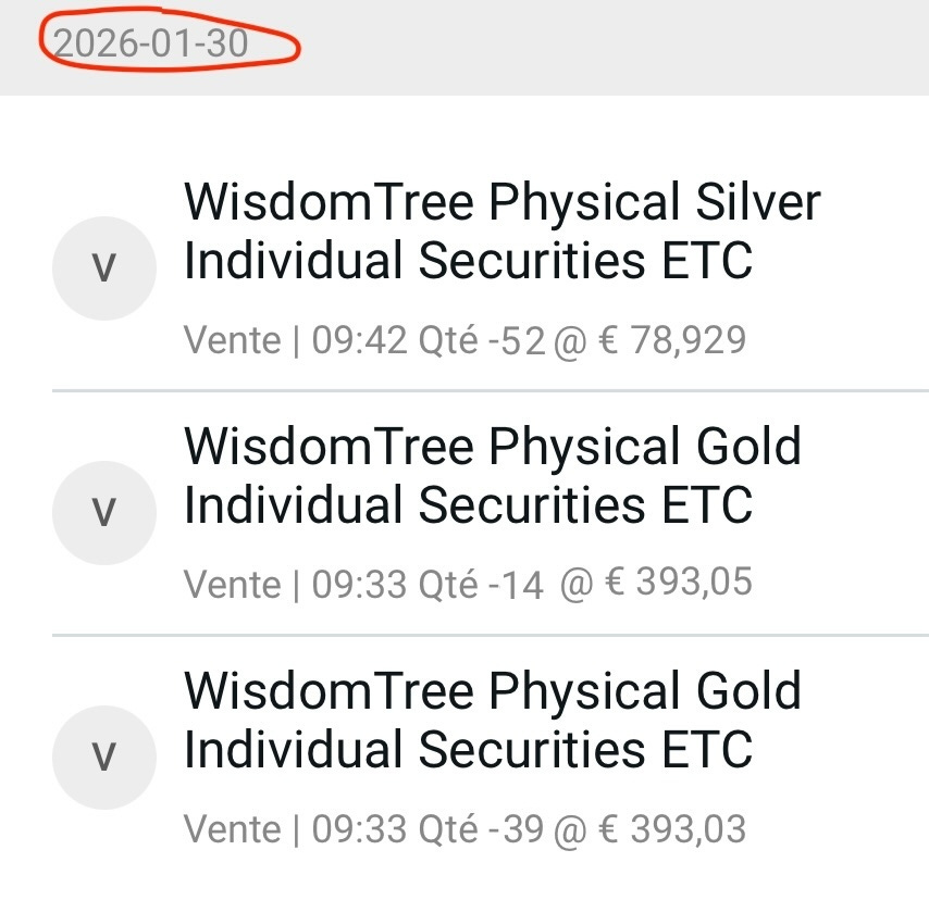 Voici une partie de mes stop-loss sur mes propres positions Or et Argent exécutés automatiquement vendredi pendant la chute :