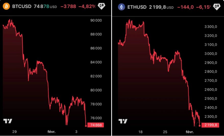 Le Bitcoin est allé chercher son plus bas niveau de 2025 à 74.457 $.