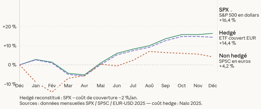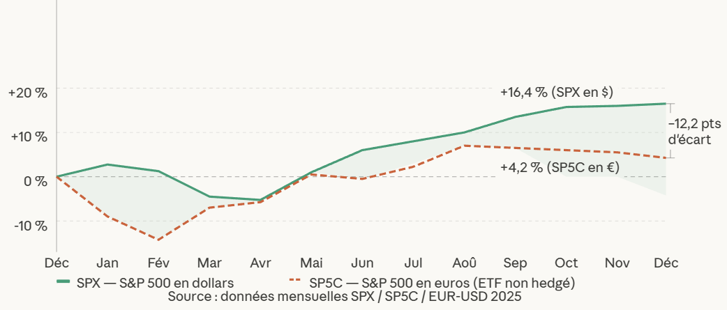 Résultat : le S&P 500 a progressé de +16,4 % en dollars, mais seulement de +4,2 % pour un investisseur européen.