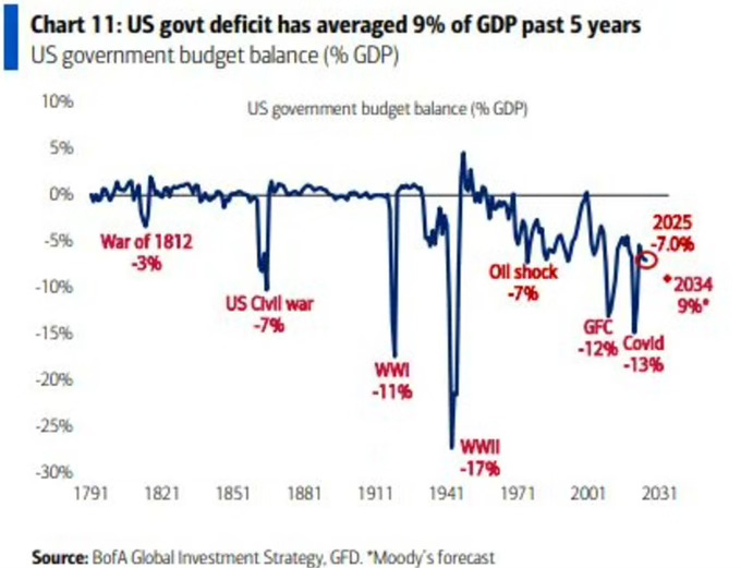 Le déficit budgétaire américain a atteint en moyenne 9 % du PIB au cours des cinq dernières années.