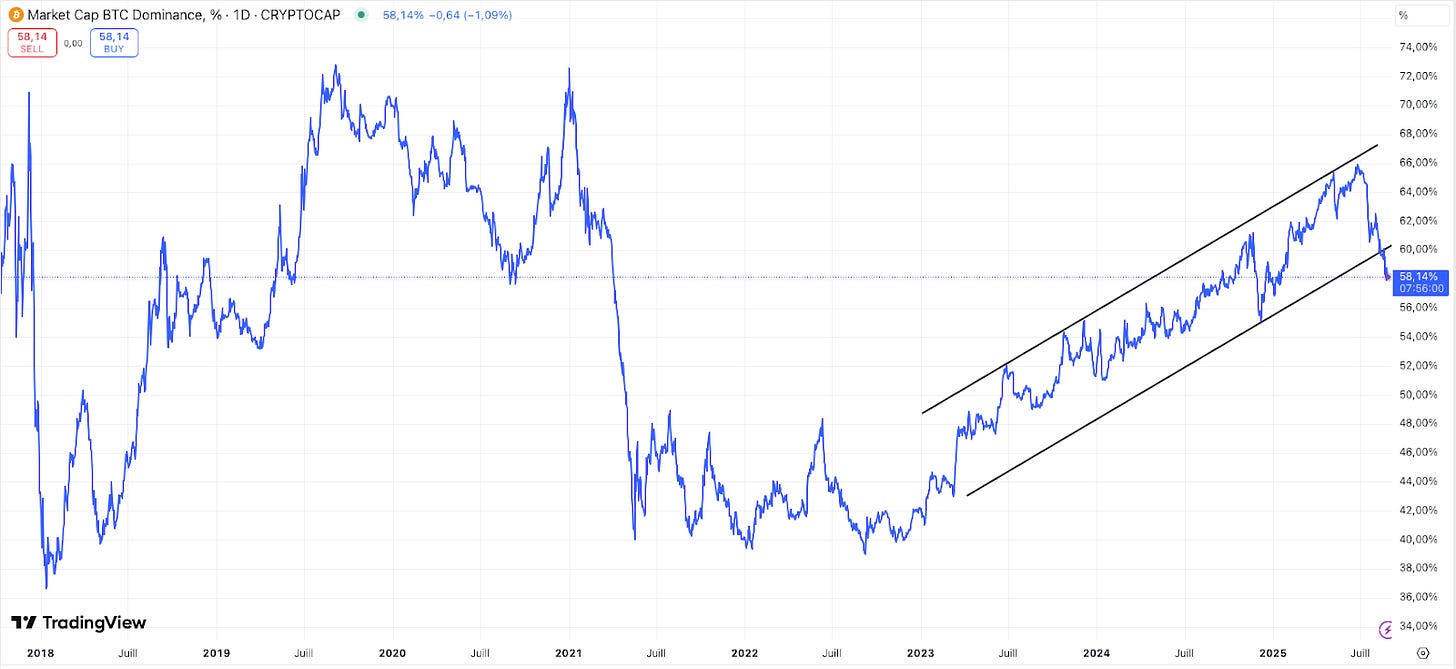 Et celle-ci semble clairement en train de sortir par le bas du canal haussier dans lequel elle évolue depuis 2023.