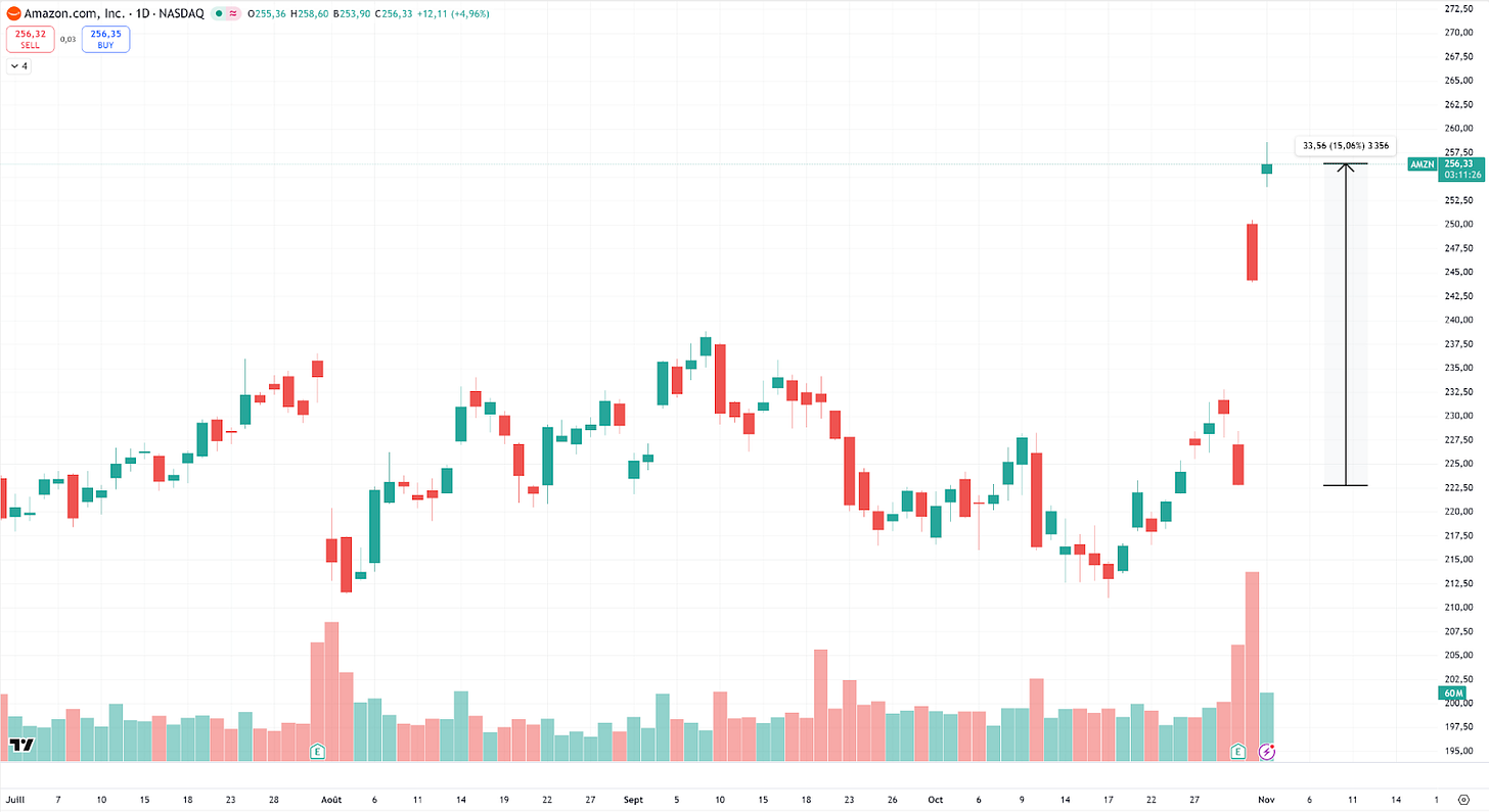 Amazon : AMZN) a pris +15% en 2 jours sur fonds de résultats trimestriels supérieurs aux attentes (+13% sur 1 an) et d’un accord stratégique avec OpenAI (38 milliards sur 7 ans).