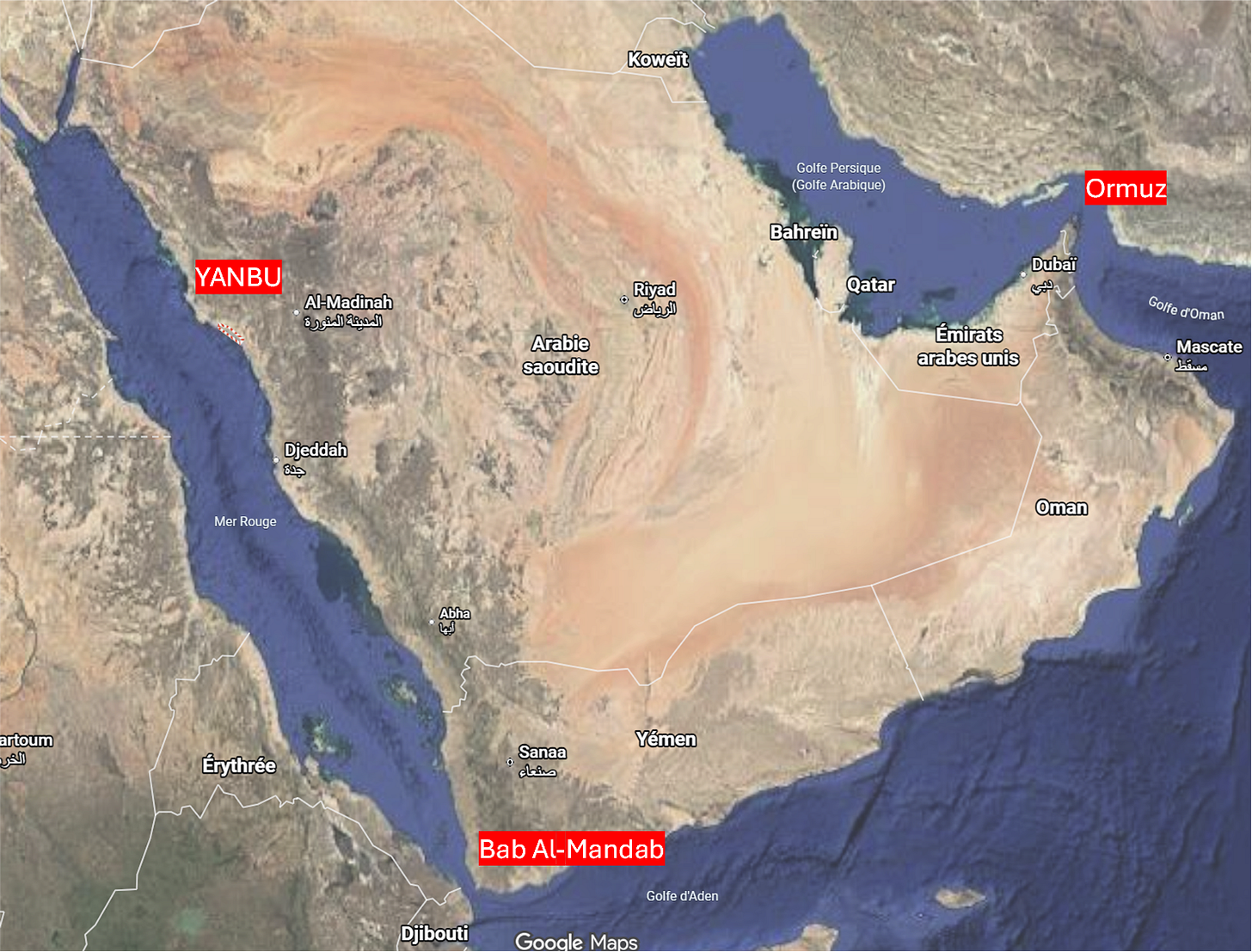 Cette bascule vers la mer Rouge met en lumière le détroit de Bab Al-Mandab, qui sépare le Yémen de Djibouti. C’est lui qui conditionne l’accès à Yanbu depuis les océans.