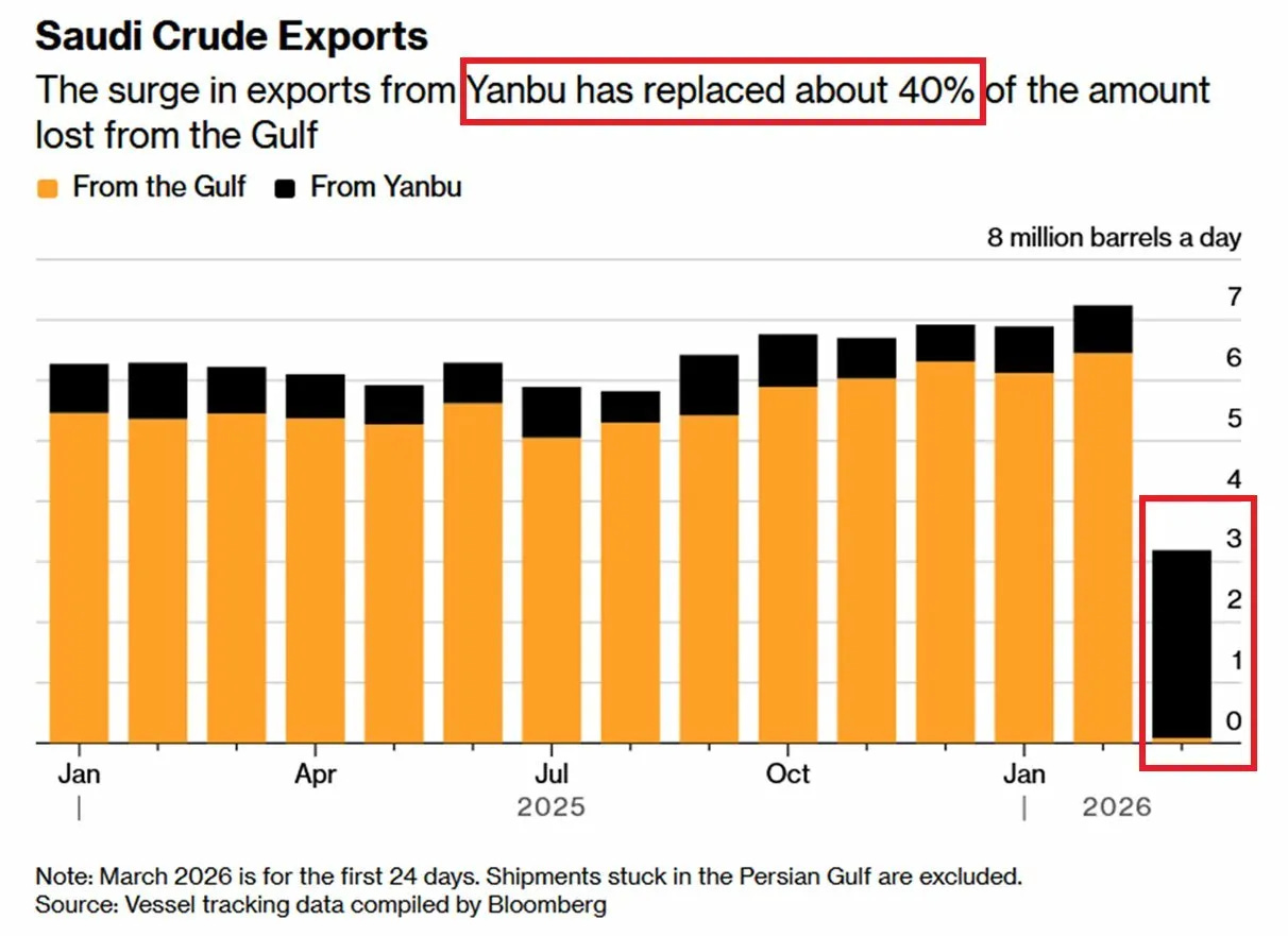 Certainement pas. En moins de deux semaines, l’Arabie Saoudite a doublé ses exportations depuis Yanbu, son grand port pétrolier sur la mer Rouge.