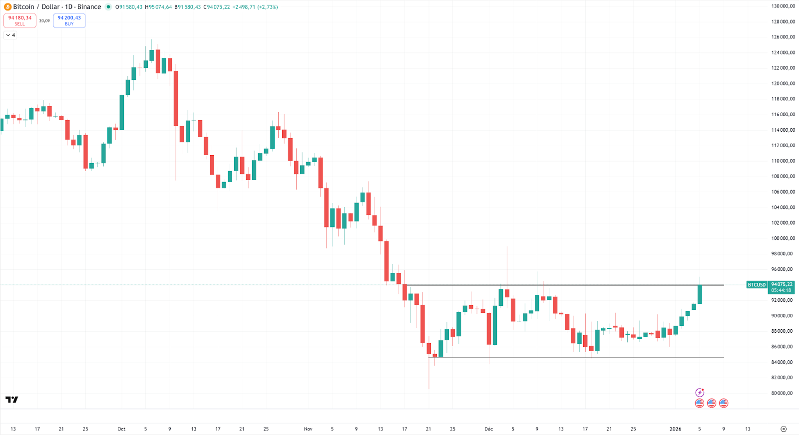 Ce n’est pas anodin : ce prix correspond à la borne haute du canal dans lequel le marché évolue depuis le 17 novembre, compris approximativement entre 84 400 $ et 94 000 $.