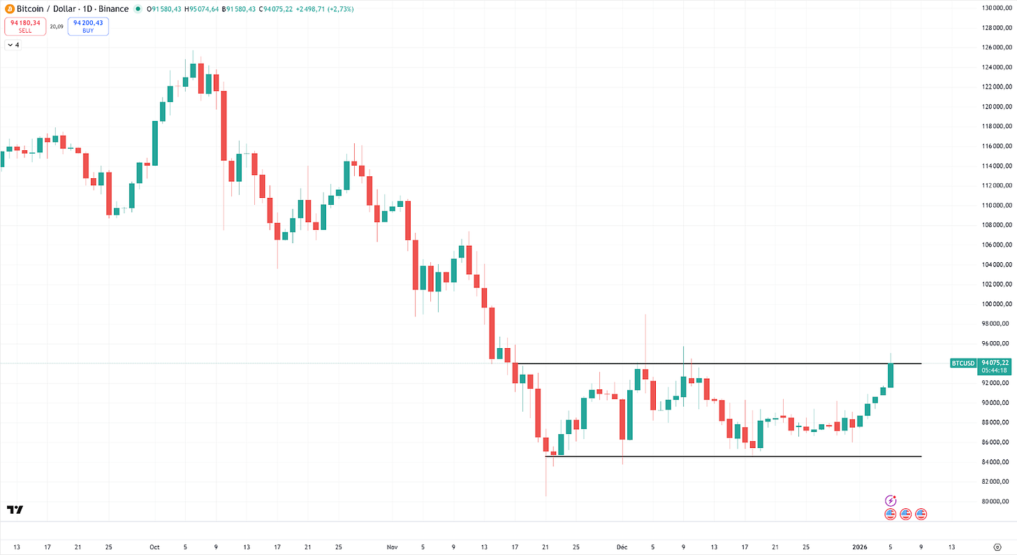 Après plusieurs semaines de consolidation et le passage à 2026, ce retour sur le haut du range marque un changement de tempo.