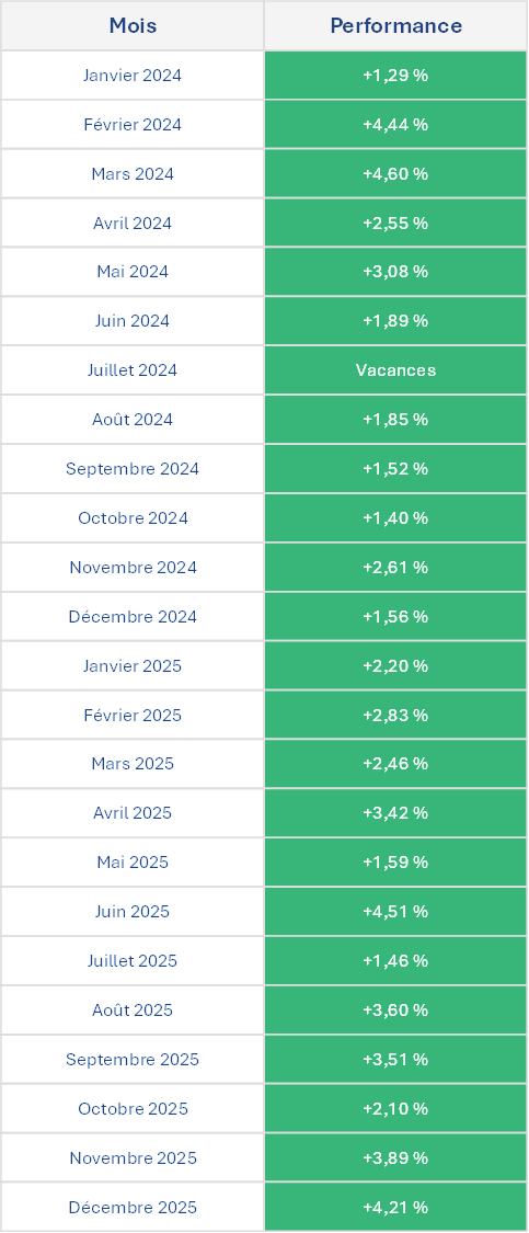 🚨 Entre 1,5 et 5 % de rendement par mois... Sans UN SEUL mois en négatif depuis 24 mois !